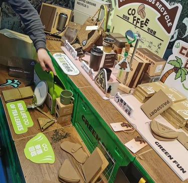 Explored eco-friendly innovations at the 51st Beijing Gifts Expo, discovering sustainable materials like cork and coffee grounds leather, and connecting with manufacturers of green notebooks, badges, and cups.
